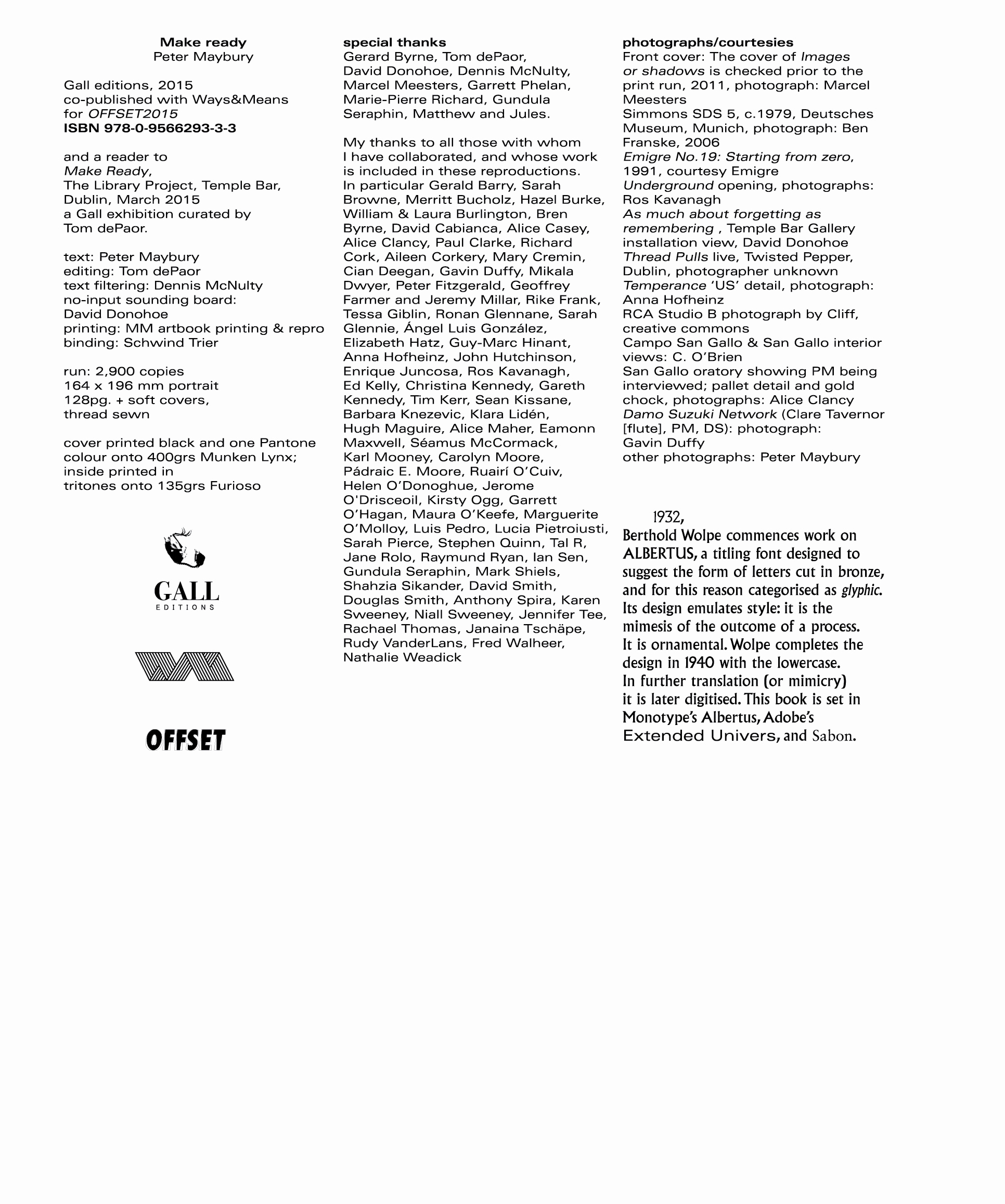 Maybury, P. (2015) Make Ready. dePaor, T., McNulty, D. (eds). Dublin: Gall Editions/Ways& Means.